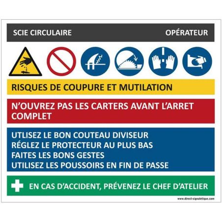 Panneau en dibond exposant les différentes informations importantes lors de l’utilisation d’une scie circulaire.